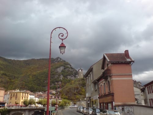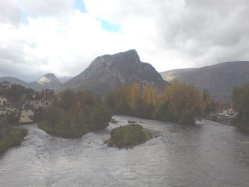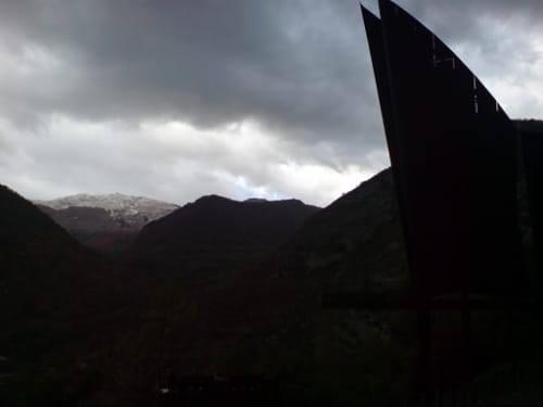We got to Tarascon-sur-Ariege one-and-a-half hours early. Parked. Looked for coffee. The snow covered peaks around, and the autumning trees, red, orange, gold. Meanwhile the sky making spotlights on the landscape. Freezing, mind you.