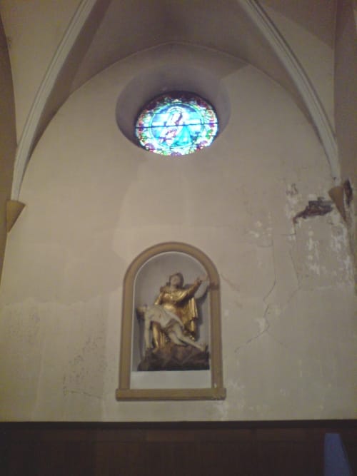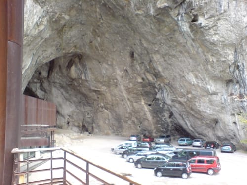 Out, into the church. A very odd Pieta. Back into the car, and up the narrowing, narrowing road to the mouth of the Niaux caves.