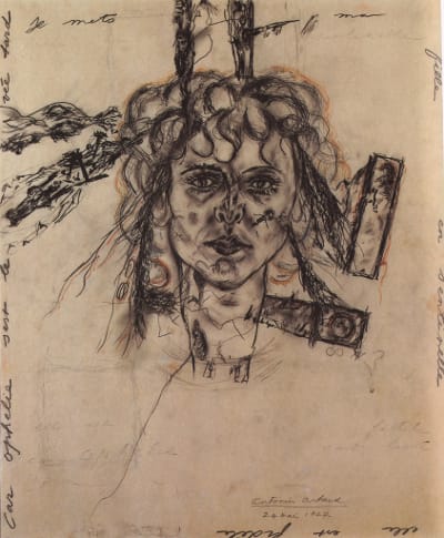 Paule Thévenin [Artaud’s friend and literary executor]described to me the process of being drawn by Artaud as that of “being skinned alive.” … Artaud … standing up before a table … would scream, hum and invent new vocabularies … The sitter was forbidden to move … but was … encouraged to talk … to Thévenin, it seemed that Artaud was intent on drawing the gestural movements of her face, in particular those of her mouth as it disintegrated into a blur and then re-cohered in the process of forming and articulating words. The act of drawing, for Artaud, was that of a revelatory excavation into what he saw as the lost or neglected materialof the human anatomy