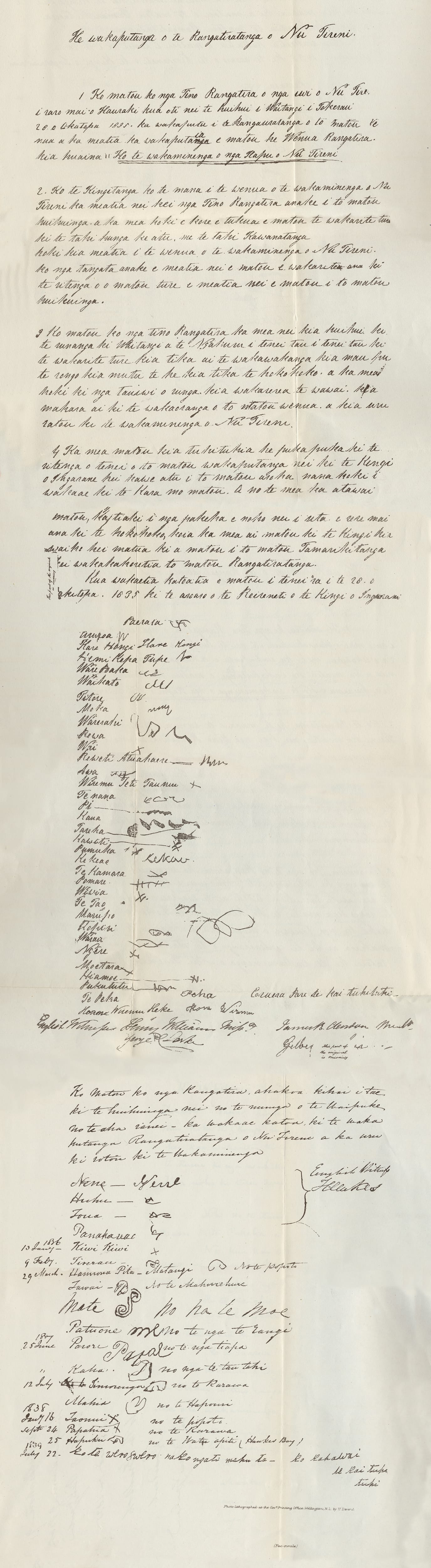 (Here follow the signatures or marks of thirty-five Hereditary chiefs or Heads of tribes, which form a fair representation of the tribes of New Zealand from the North Cape to the latitude of the River Thames.) English witnesses: