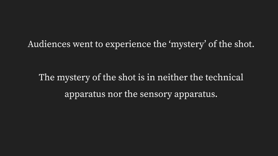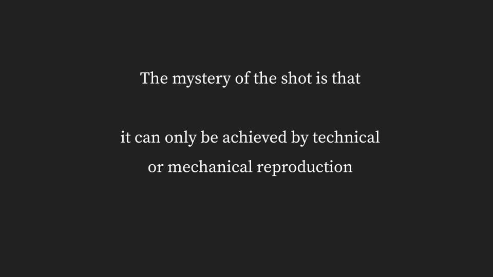 The mystery of the shot is that it shows what cannot be achieved by any of these means. The mystery of the shot is that it can only be achieved by technical or mechanical reproduction.