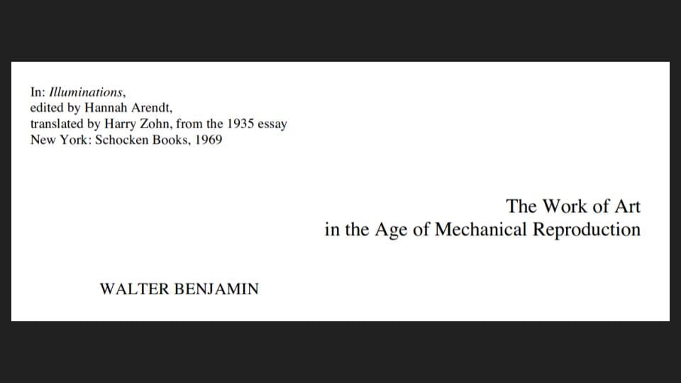 Walter Benjamin is misunderstood in his essay of 1935 if it is thought he is referring to what is particular to an artwork, or to what is unique and singular in general. The title of this essay is not “The Work of Art in the Age of Its Reproduction.”