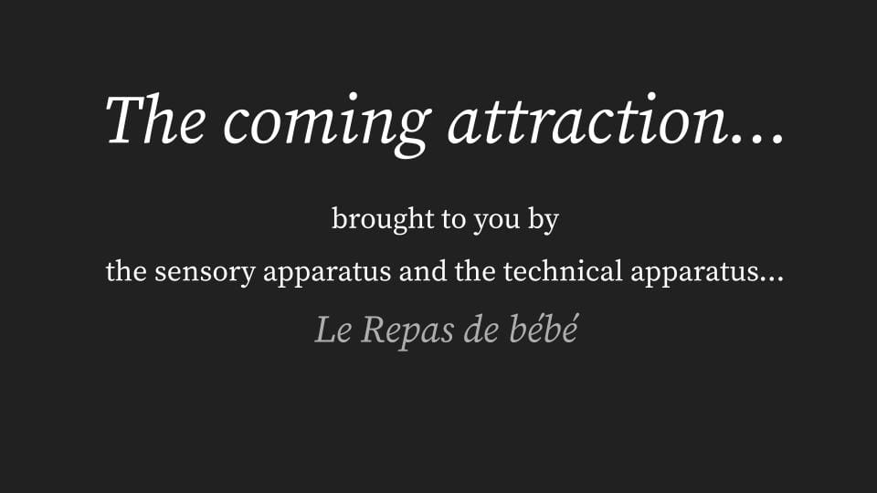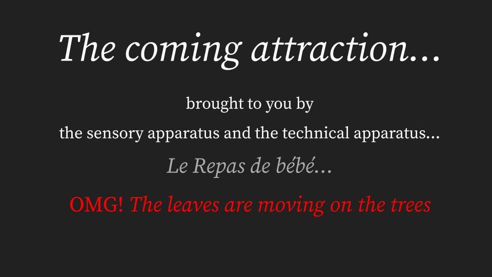 Was it for this reason the mystery of the shot captured by the cinematograph and depicted on the screen was not Le repas de bébé as advertised but the leaves moving on the trees...?