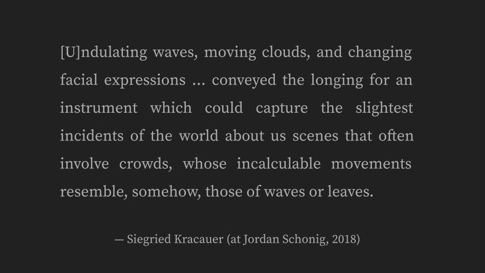 And, as we’ve said, from these the first cinematic genre of the ‘wave film’ ... capturing nature in the act... As the German film theorist Siegfried Kracauer put it, and this Jordan Schonig has as an epigraph to his excellent article from which I am working, and from which I am departing.