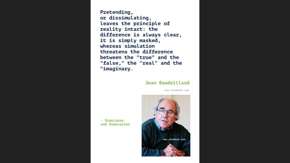 Jean Baudrillard by thinking through the image as a commodity form, as the commodity form belonging to capitalism, leads the way for Elon Musk’s belief that we inhabit a simulation, a computer simulation. And also, the Matrix.
