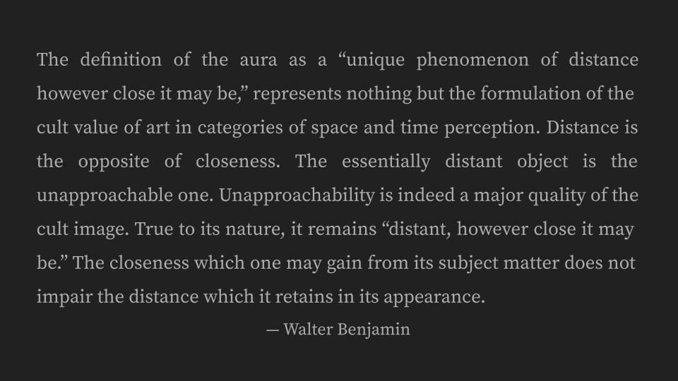 And what is this aura? Benjamin states it... I’ve found it so interesting going back to this essay, because it’s clear that its problem is the moving sound image and both the cinematic and the televisual, meaning, as we know, distance seeing: