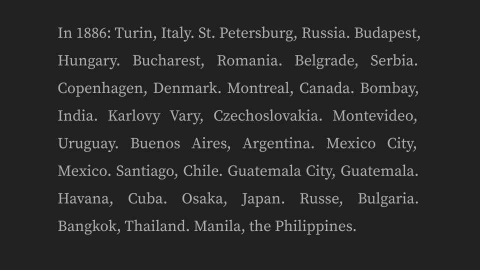 In 1896, alone: Turin, Italy. St. Petersburg, Russia. Budapest, Hungary. Bucharest, Romania. Belgrade, Serbia. Copenhagen, Denmark. Montreal, Canada. Bombay, India. Karlovy Vary, Czechoslovakia. Montevideo, Uruguay. Buenos Aires, Argentina. Mexico City, Mexico. Santiago, Chile. Guatemala City, Guatemala. Havana, Cuba. Osaka, Japan. Russe, Bulgaria. Bangkok, Thailand. Manila, the Philippines.
